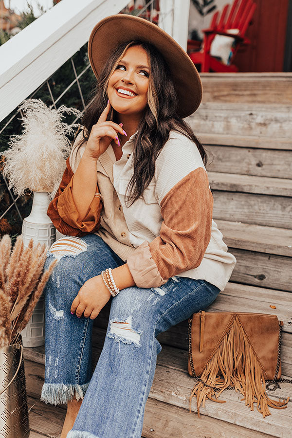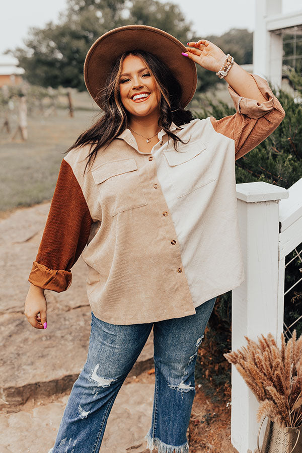 Plus Size - No other piece screams "fall is here" like our adorable 'County Line' top featuring lightweight corduroy material with ivory, iced latte, and camel hued color block panels, a button up front with a collared neckline, long loose sleeves with button closure cuffs that can be rolled, two accent chest pockets with flap closures, and a relaxed silhouette that falls into a rounded hemline!