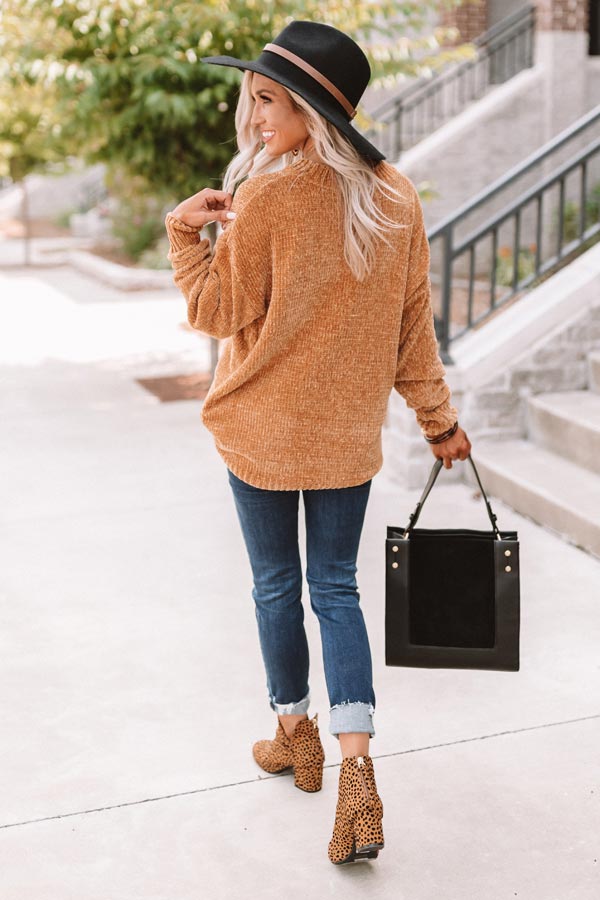 Your fall style will be throwing a "cozy celebration" when you wear this mustard sweater featuring an ultra soft chenille texture, a wide high rounded neckline, long loose sleeves with fitted cuffs, and a relaxed silhouette that falls into a straight tunic length ribbed hemline! This versatile piece can be styled with some distressed ankle skinnies, a statement belt and jewelry, leopard booties, and a black tote and faux suede hat, or you can pair it with some white flares, "The Seraphina Faux Leather Wedge in Brown," and our "All Caught Up Headband in Ivory!" Measurements