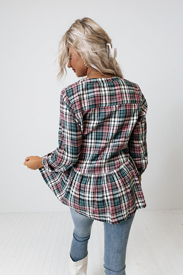 We have no doubt you will fall in love with this adorable top featuring lightweight flowy material patterned with a blue and pink hued plaid print, a button up front with a rounded neckline, loose 3/4-length sleeves with roll tab cuffs, two accent chest pockets, and a relaxed silhouette that falls into a peplum hemline!