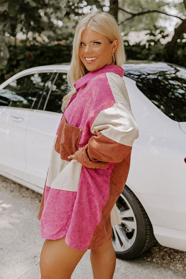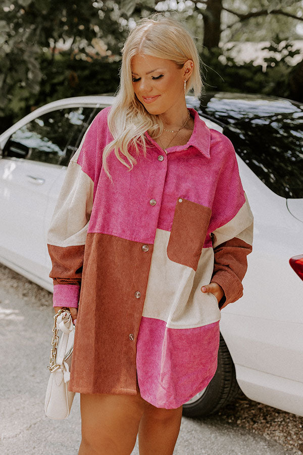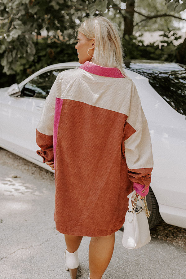 Cozy up in our adorable plus size 'Felt The Chill' top featuring trendy corduroy material with beige, rust, and vineyard grape colored color block panels, a button up front with a collared neckline, long loose sleeves with button closure cuffs, a single accent chest pocket, and a relaxed silhouette that falls into a rounded hemline!