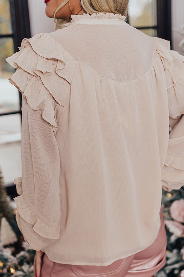 Pop the champagne, we have a new fave piece! This light beige colored shift top features lightweight chiffon material, a v-cut neckline with a tie closure collar, long oversized sleeves with ruffled accent seams, and a relaxed silhouette that falls into a straight hemline! Measurements