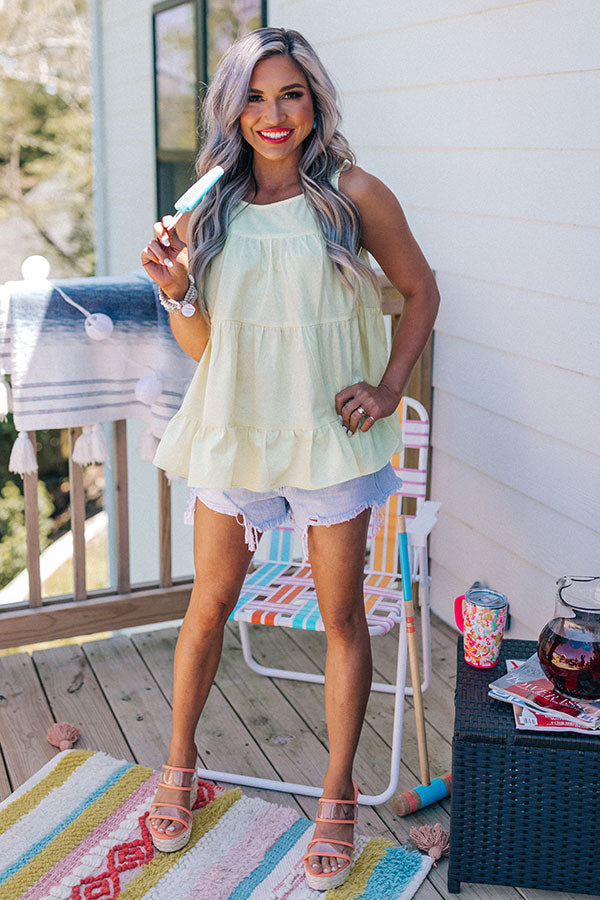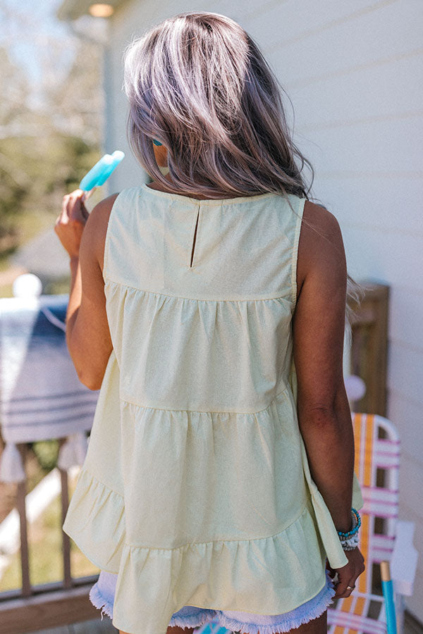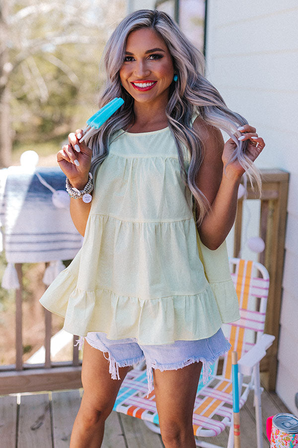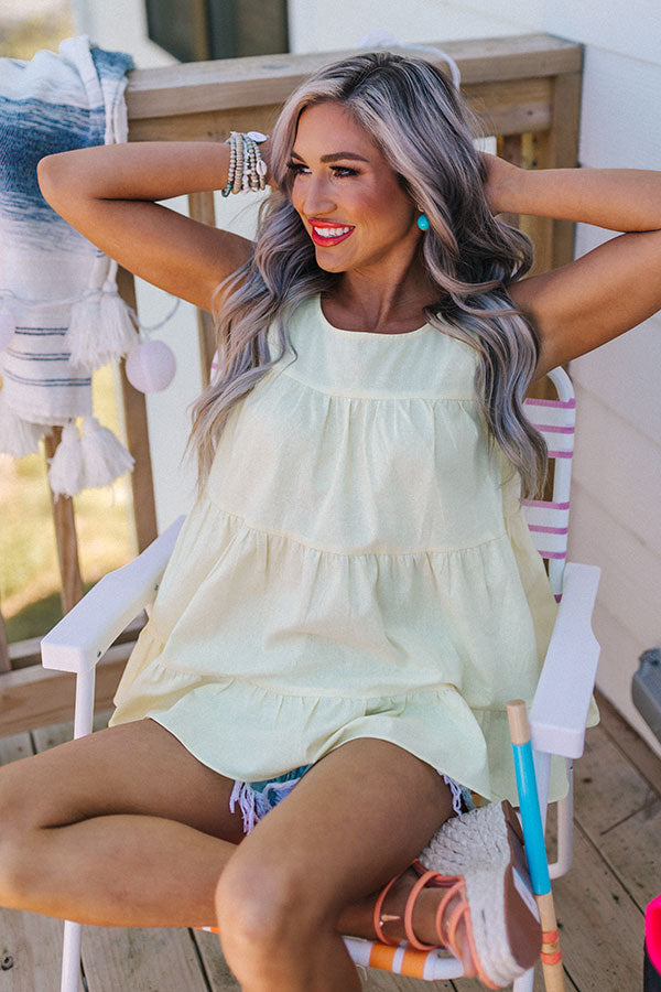 We have no doubt you will look delightful when you arrive to happy hour with the girls in this charming light yellow top featuring lightweight flowy material, a rounded neckline with wide shoulder straps, a keyhole accented upper back with a button closure, and a flattering tiered silhouette that falls into a ruffled hemline! Measurements