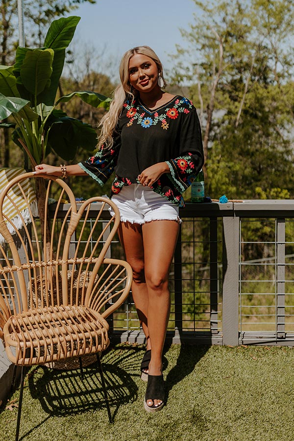 Keep your summer wardrobe festive with our pretty black 'Hear The Waves' shift top featuring lightweight material with stunning colorfully embroidered floral detailing, a high v-cut neckline, loose 3/4-length sleeves, and a relaxed silhouette that falls into a straight tunic-length hemline! on products