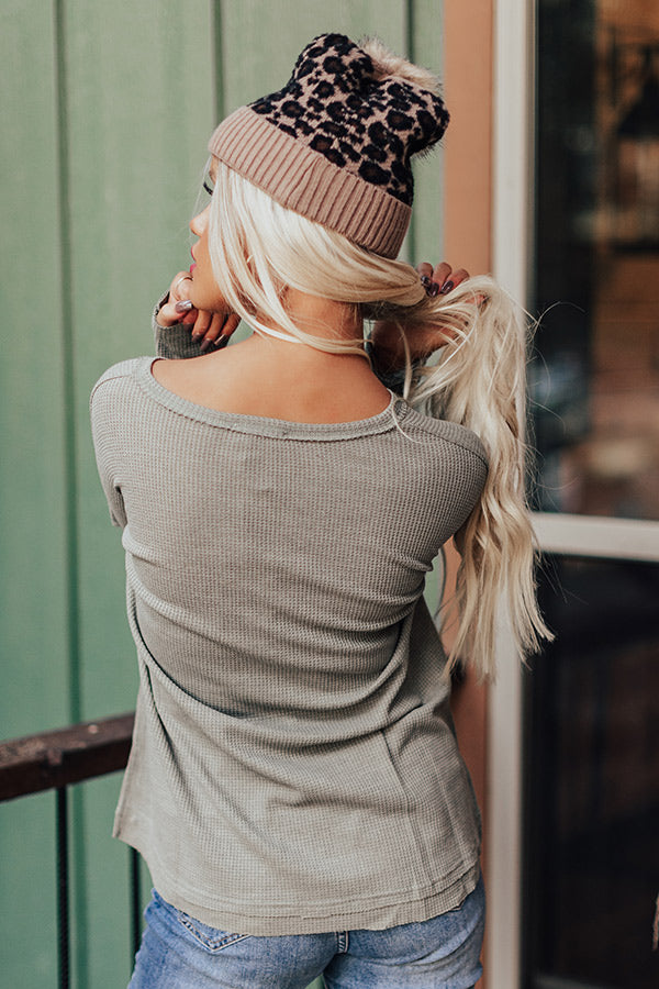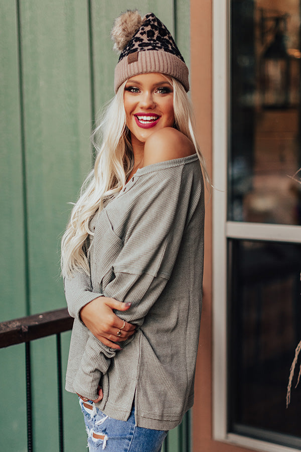 Take on fall in style with our casual pear colored "Hidden Trail Henley Top" featuring soft lightweight flowy material with small waffle knit texturing, a v-cut neckline with lace-up eyelet detailing, long loose sleeves, a single accent chest pocket, exposed raw cut seams and trim, and a relaxed silhouette that falls into a straight hemline with side slits! Measurements