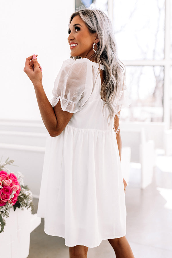 We have no doubt you will be instantly lovestruck when you wear this beautiful white dress featuring lightweight flowy material, a square neckline and upper back with a tie closure, semi-sheer puff sleeves with ruffled cuffs, hidden side pockets, and a flattering babydoll silhouette that falls into a straight mid-thigh length hemline!