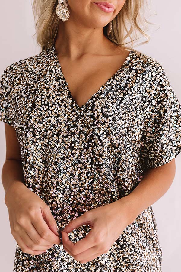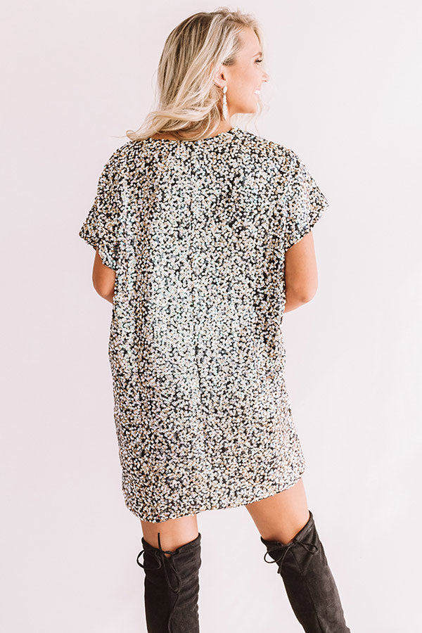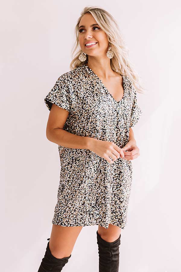Whether you are headed out for new years, a girls night, or to a gala, this glitzy dress can be worn for all occasions! It features black material covered in pastel colored sequins, a v-cut neckline, short sleeves, and a draped t-shirt silhouette that falls into a straight mid-thigh length hemline!
