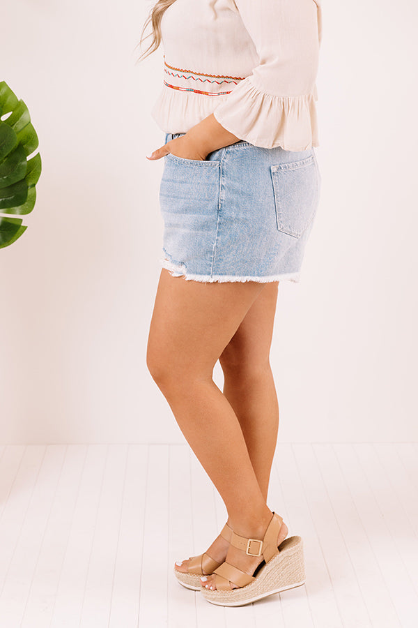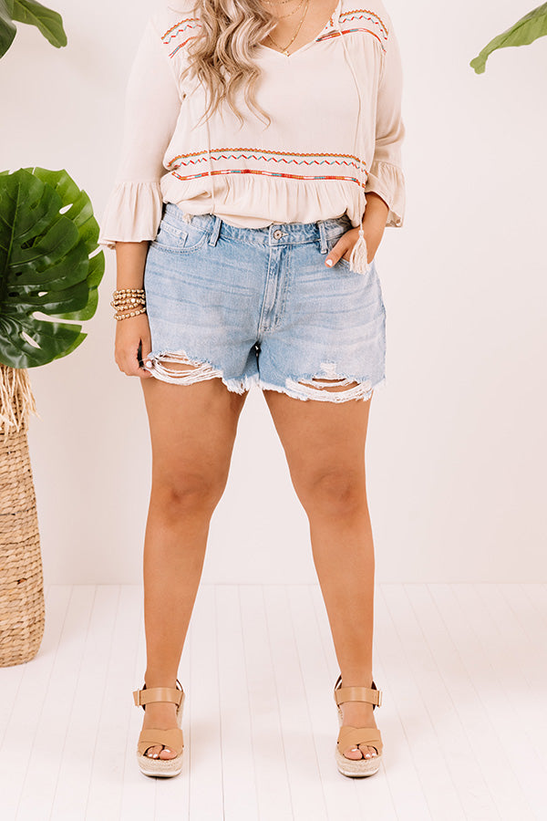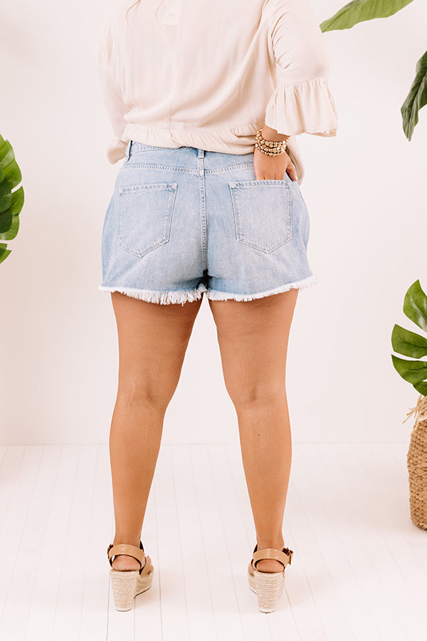 Plus Size - The adorable 'Jude' shorts feature lightweight stretchy denim material, subtle distressed detailing, a high waist fit, a hidden zip fly with a button closure, belt loops, a light wash color, five pocket cuts, and a relaxed silhouette that falls into frayed upper-thigh length hemlines!