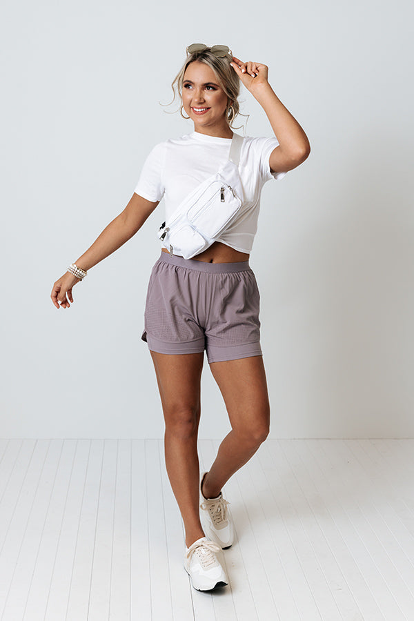 Take a light jog or just run some errands in these casual heirloom lilac hued athleisure shorts featuring lightweight material, a stretchy waistline, sewn in biker shorts underneath, an accent pocket in the back with a zip closure, and a flattering silhouette that ends in straight upper-thigh length hemlines! Measurements
