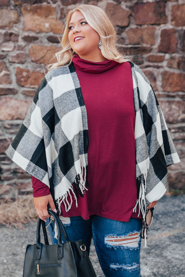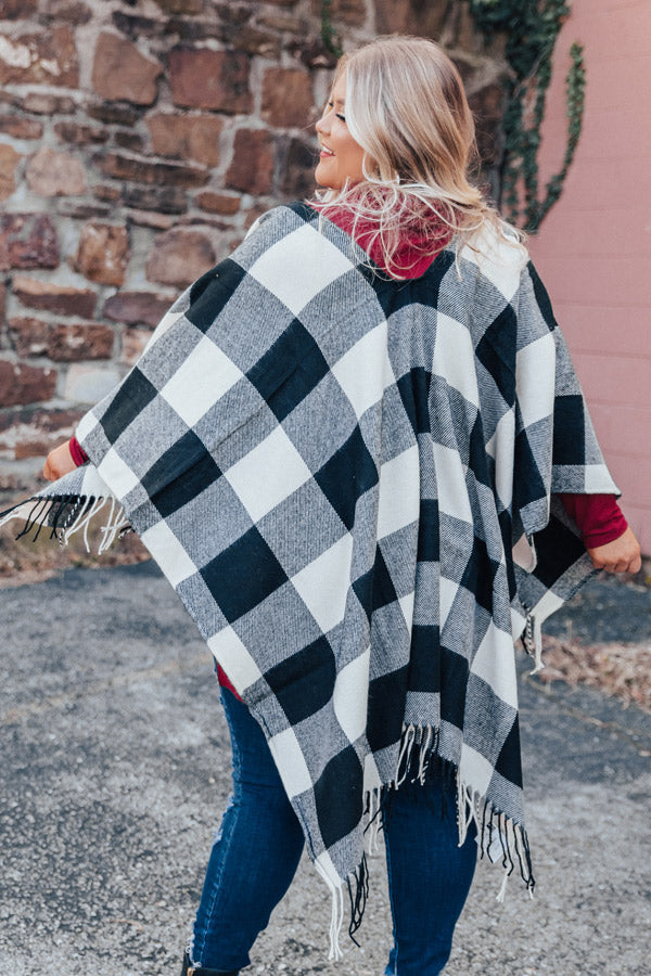 Stay warm and protected from those chilly "Manhattan mornings" with this adorable poncho featuring soft material patterned with a bold black and white buffalo check pattern, long fringed trim detailing, and an ultra draped silhouette that falls into an uneven hemline! You can style this versatile piece with just about anything from a basic tank to a sweater, jeans to skirts or dresses, booties to wedges or sandals, clutches to totes, and hats to earrings!