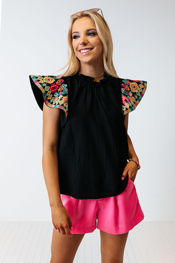 Step out looking amazing in our pretty black 'Near To Paradise' shift top featuring lightweight material, oversized cap sleeves with colorfully embroidered floral detailing, a rounded neckline, a keyhole accented upper back with a button closure, and a relaxed silhouette that falls into a straight hemline!