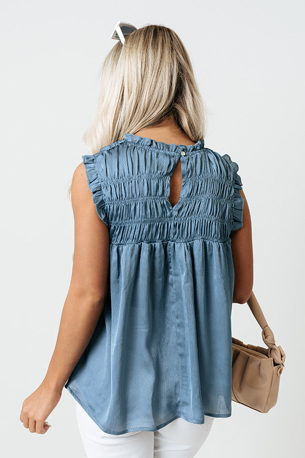 People are guaranteed to ask where you got our adorable airy blue colored 'Need To Know Basis Top' featuring lightweight breezy material, intricate smocked detailing around the bodice, a high neckline and sleeveless fit with ruffle trim detailing, a keyhole accented upper back with a button closure, and a relaxed silhouette that falls into a straight hemline! Measurements