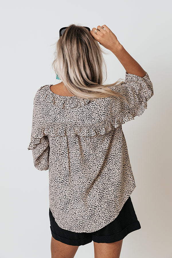 We have no doubt you will look so pretty in this flirty shift top featuring lightweight flowy material patterned with a small black spotted print, a ruffled accent seam across the bodice and down the loose half sleeves, a tie closure v-cut neckline, and a relaxed silhouette that falls into a rounded hemline!