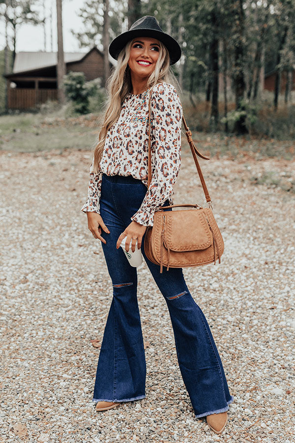 You are sure to turn heads in our eye-catching ivory hued "Party For Two" shift top featuring lightweight flowy material patterned with a large camel and charcoal hued leopard print, long bubble sleeves with flared cuffs, colorfully embroidered detailing around the bodice, a high rounded neckline, and a relaxed silhouette that falls into a straight hemline! Measurements