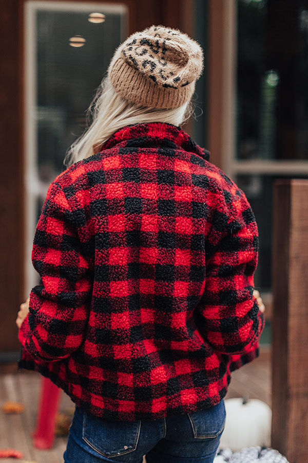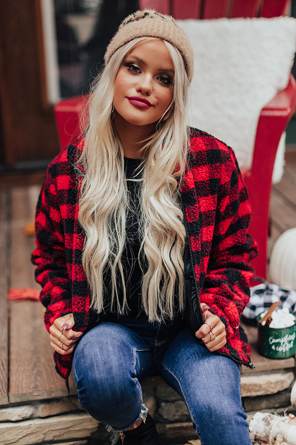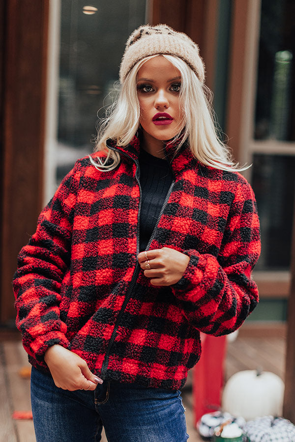 You will surely be in "plaid heaven" when you wear this festive jacket featuring ultra soft and thick sherpa material patterned with a bold black and red buffalo check print, long loose sleeves with fitted cuffs, a zip front with a collared neckline, accent side pockets, and straight hemline! Measurements