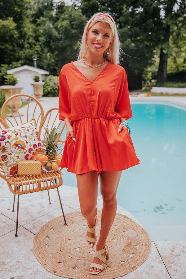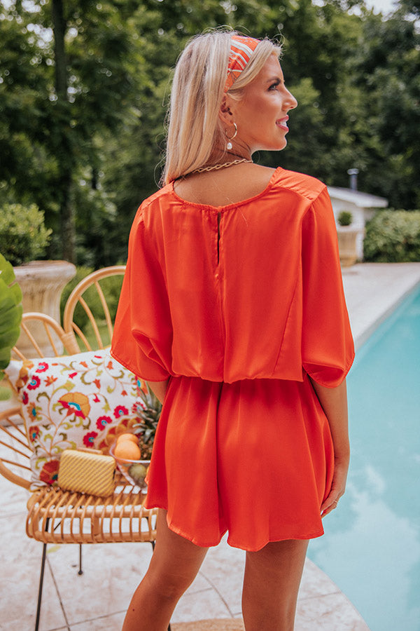 You are guaranteed to have a regal night when you wear this gorgeous tangerine colored romper featuring lightweight satin material, a v-cut neckline, flowy half sleeves, a cinched waistline, a keyhole accented upper back with a button closure, hidden side pockets, and a relaxed shorts silhouette that falls into an uneven upper-thigh length hemline!