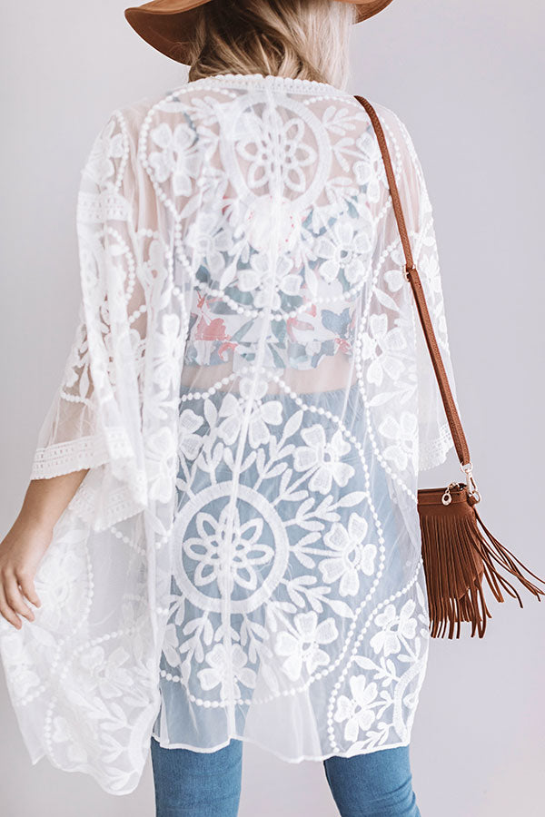 Hit the pool in style in the "Resort Luxe Lace Overlay!" This gorgeous floral lace overlay has short kimono sleeves & an ultra breezy open front silhouette with an optional tie waist. Easily transition your look from pool to patio by adding a tank & denim shorts to your look!