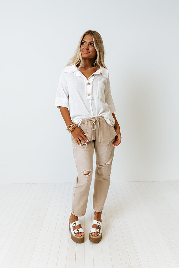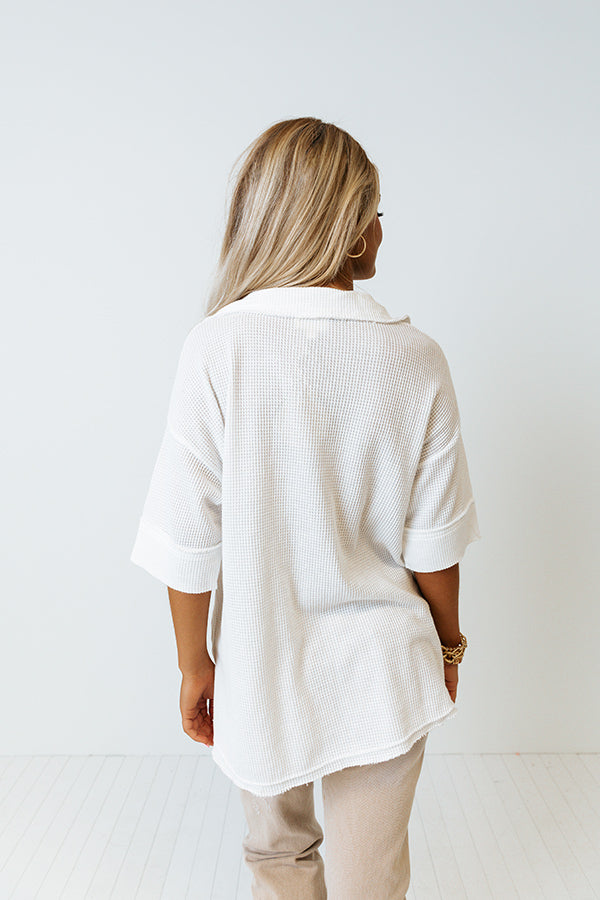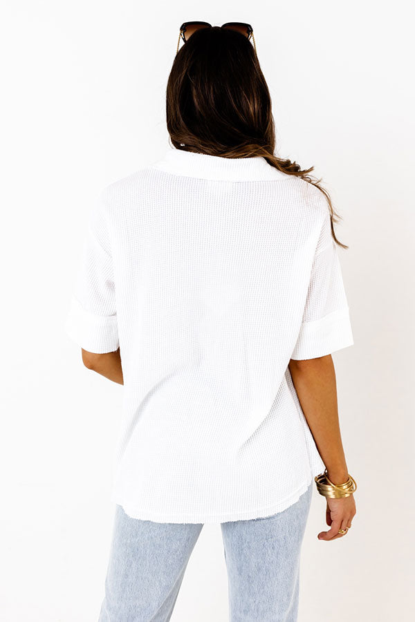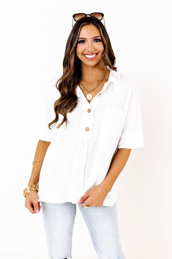 Keep casual in our simple but stylish white 'Sailing Away' top featuring lightweight material with waffle knit texturing, a button up bodice with a collared neckline, a single accent chest pocket, loose half sleeves, and a relaxed silhouette that falls into a straight hemline!