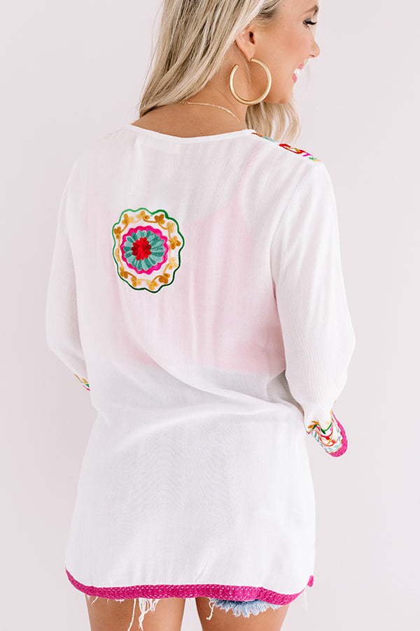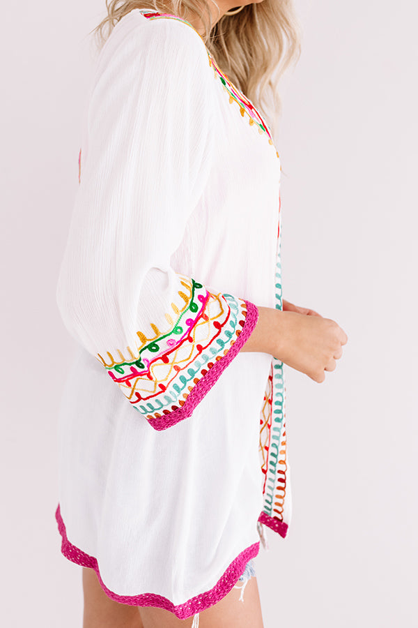 Layer up for summer in style with our adorable white "Sandy Dream" overlay featuring ultra lightweight breezy material patterned with intricate and colorful embroidered detailing, oversized flared half sleeves, and a relaxed open front silhouette that falls into a straight tunic length hemline! You can layer this versatile piece with just about anything from a basic tank and distressed denim to your fave swimsuit!