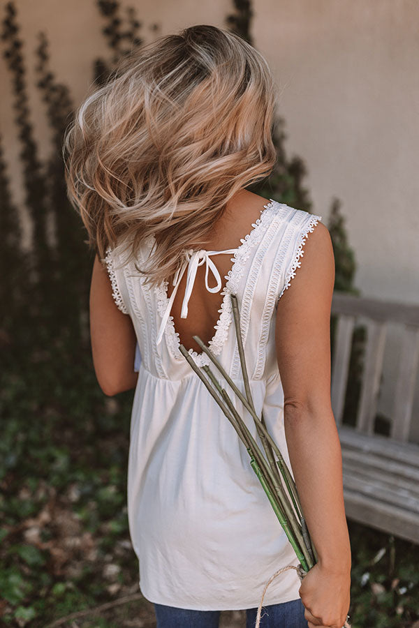 This serene tank features crochet trim on the neckline and wide straps, a breezy bodice, and a v-back with a tie closure across the shoulders! Style with some distressed skinny jeans, oversized sunnies, and a compact clutch for an enchanting everyday outfit that can be worn to the farmers market and then to brunch! Measurements