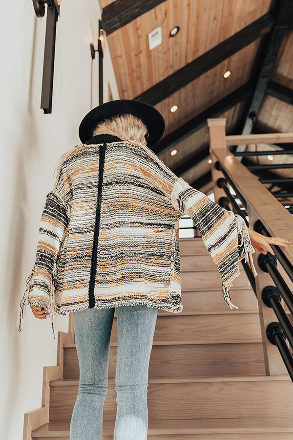 Showcase your love for fall with this beautiful cardigan featuring thick camel, black, and ivory hued knit material, long oversized sleeves with flared fringe trim cuffs, and a draped open front silhouette that falls into a straight hemline!