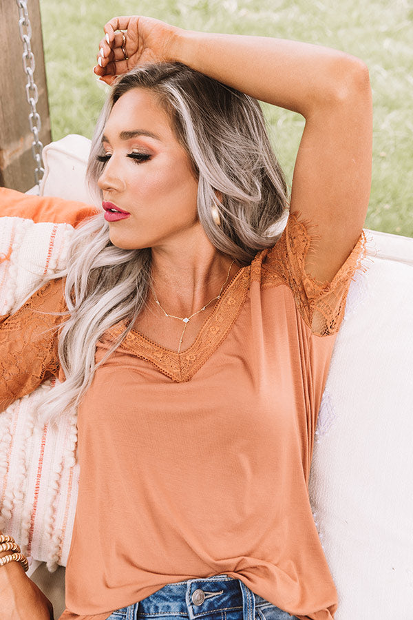 Upgrade your wardrobe with our darling rust colored "Sights On The Sea" top featuring lightweight material, a v-cut neckline and square upper back with lace trim detailing, short semi-sheer lace sleeves, and a relaxed silhouette that falls into a straight hemline! This cutie styles perfectly with some distressed medium wash skinnies and neutral peep toe booties, but you can also wear it with some frayed black shorts, "The Alba Wedge in Rust," sunnies, and our "Chic Harmony Fringe Tote in Black!"