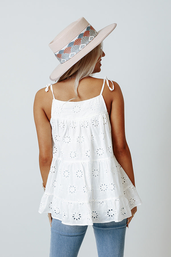 You will undoubtedly look so darling in this beautiful white top featuring lightweight material with circle eyelet detailing, a straight neckline and upper back with tie closure spaghetti straps and a tiered silhouette that flares into a straight hemline!