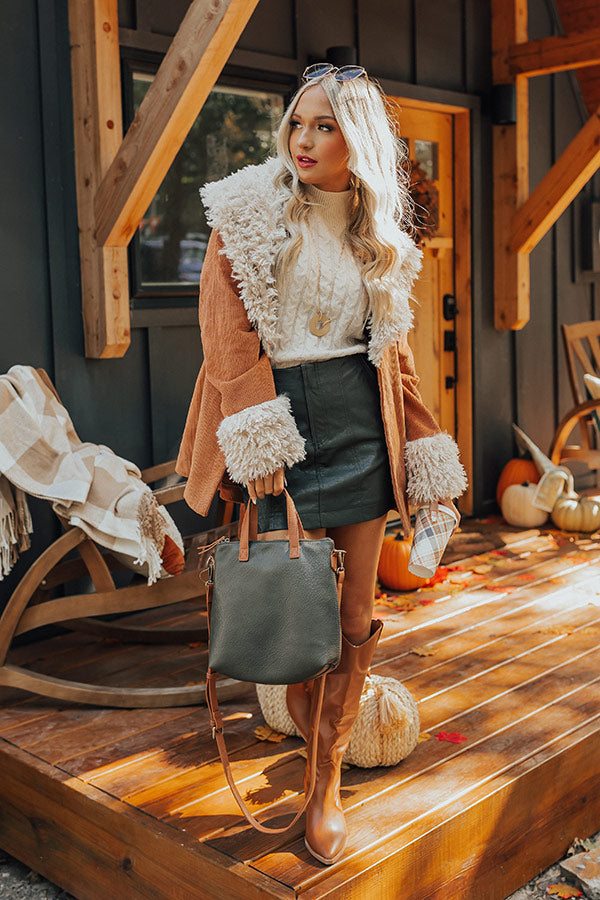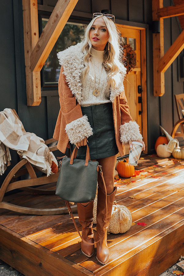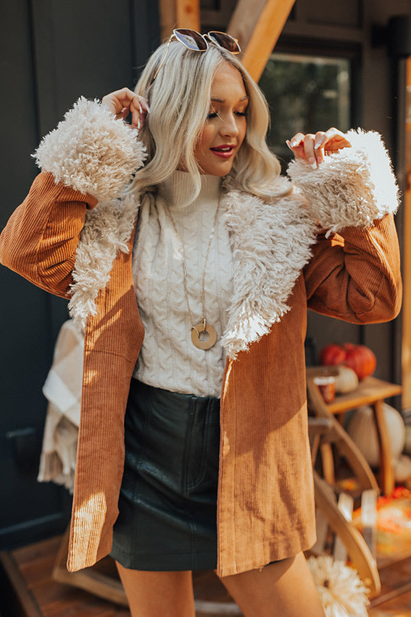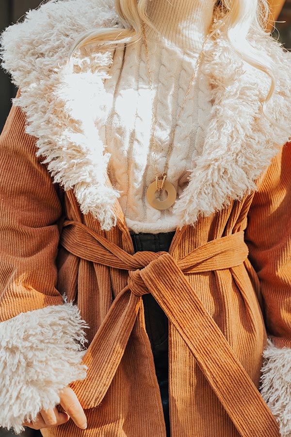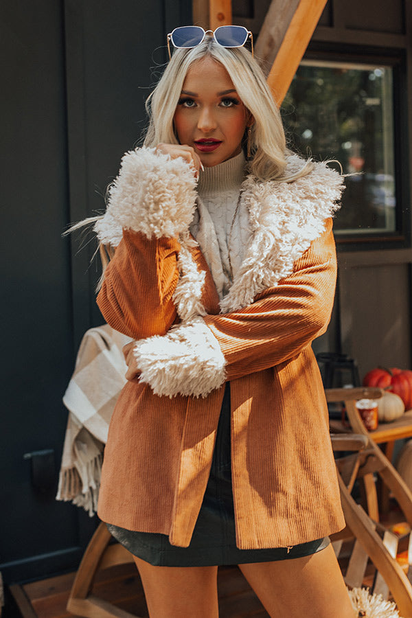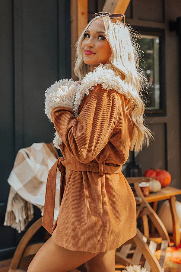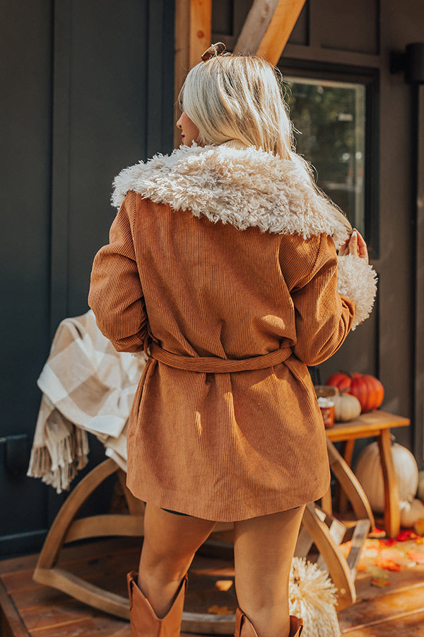 You'll be ready to take in the beauty of fall in our 'Stars Hollow' jacket! Features camel colored corduroy material, trendy faux fur collar, long loose sleeves with faux fur cuffs, belt loops and belt tie closure, functional side pockets, and a relaxed silhouette that falls to a straight hemline.