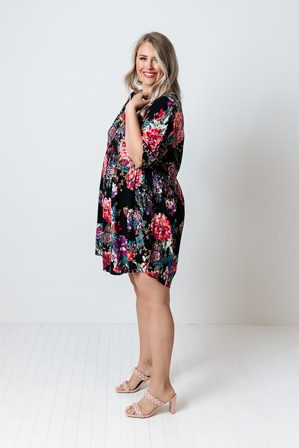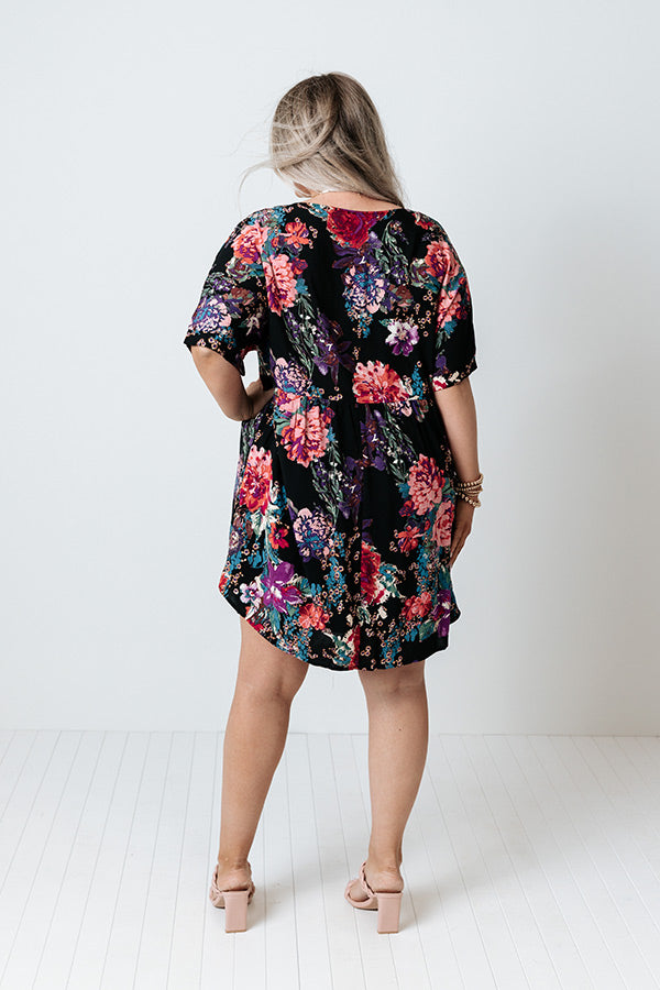 Plus Size - Stroll through summer in style with this eye-catching black dress featuring lightweight breezy material patterned with a bold and colorful floral print, a v-cut neckline, short loose sleeves, and a relaxed babydoll silhouette that falls into a straight mid-thigh length hemline! Measurements