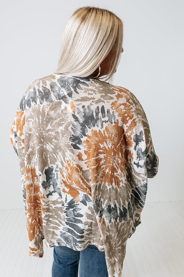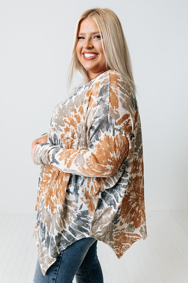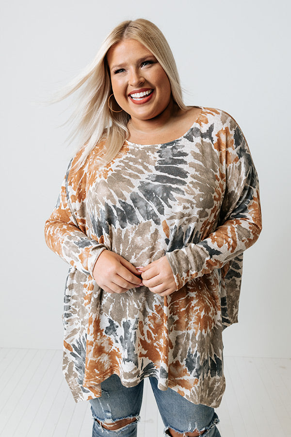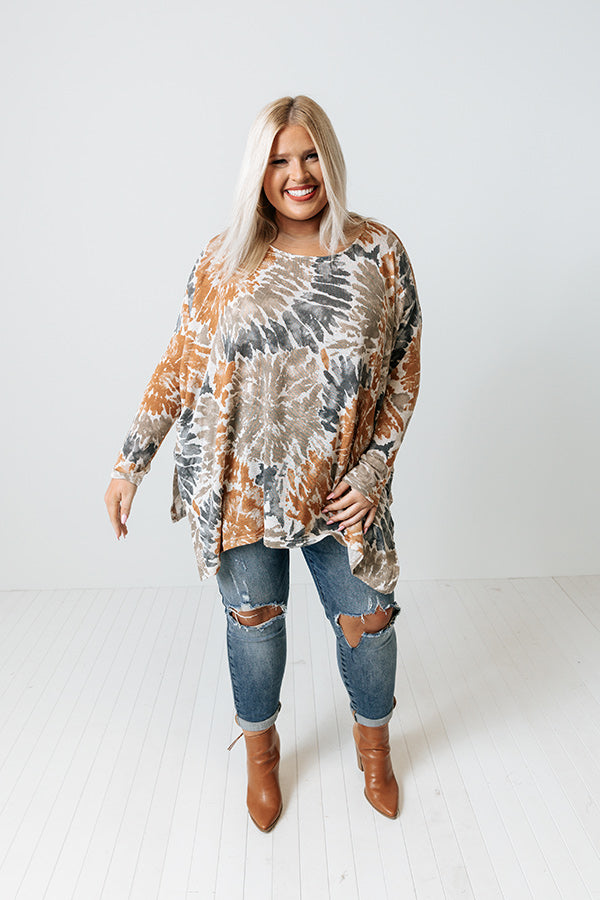 Create your own sunshine with this adorable plus size top featuring soft lightweight and flowy material patterned with rust, taupe, and navy hued tie dye, a rounded neckline, long sleeves, and a relaxed silhouette that falls into an uneven tunic-length hemline! Measurements