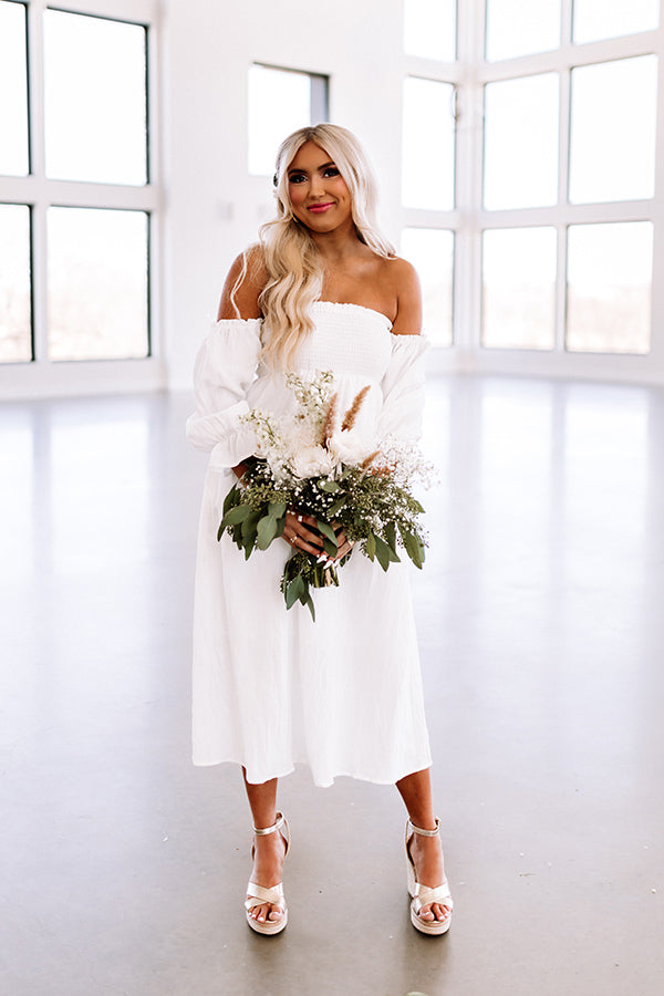 Fashion will look like your specialty when you arrive in this beautiful white midi dress featuring lightweight material, a smocked bodice with a straight elastic hemline, long bishop drop sleeves with subtly ruffled cuffs, hidden side pockets, and a relaxed skirt silhouette that falls into a straight mid-calf length hemline!