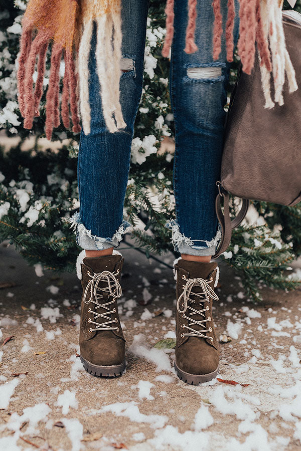There is no better shoe to walk in a winter wonderland with than "The Brooklyn" boot featuring army green colored faux suede material, faux fur accents, a 2.5-inch heel, rounded closed toes, a lace up front, and an over the ankle silhouette!