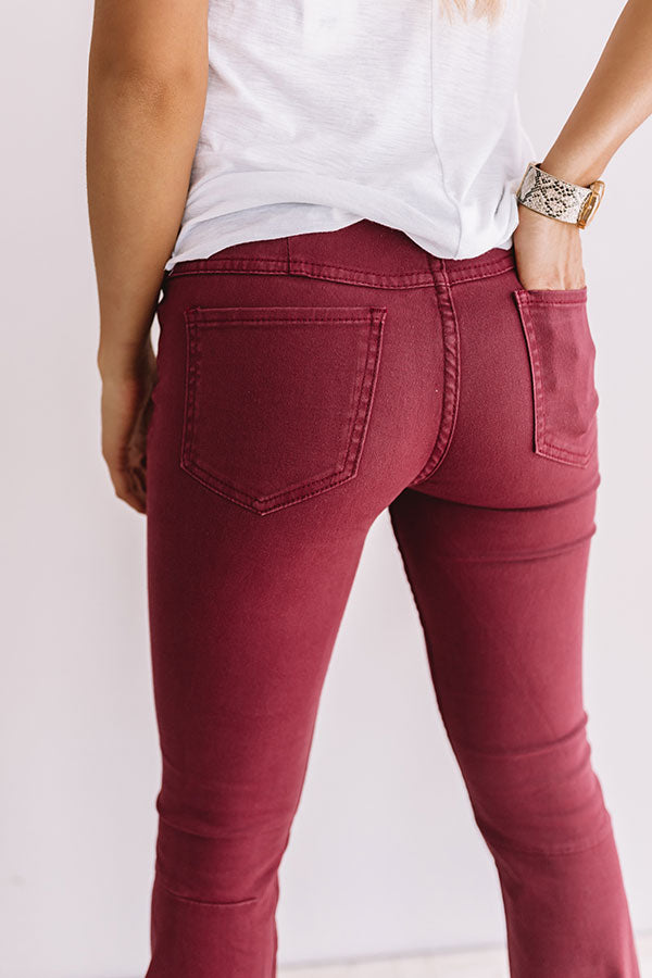 These dark red jeans are perfect for wearing through all four seasons with their stretchy, figure flattering mid rise fit that leads into a trendy and flared raw hem cut! Plus, they have 5 pocket cuts with belt loops, a hidden zip fly, and button closure making sure these jeans are hugging you in all the right places!