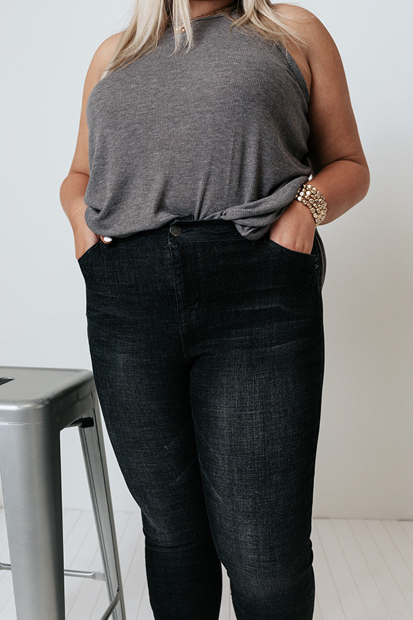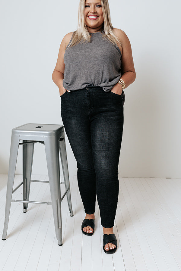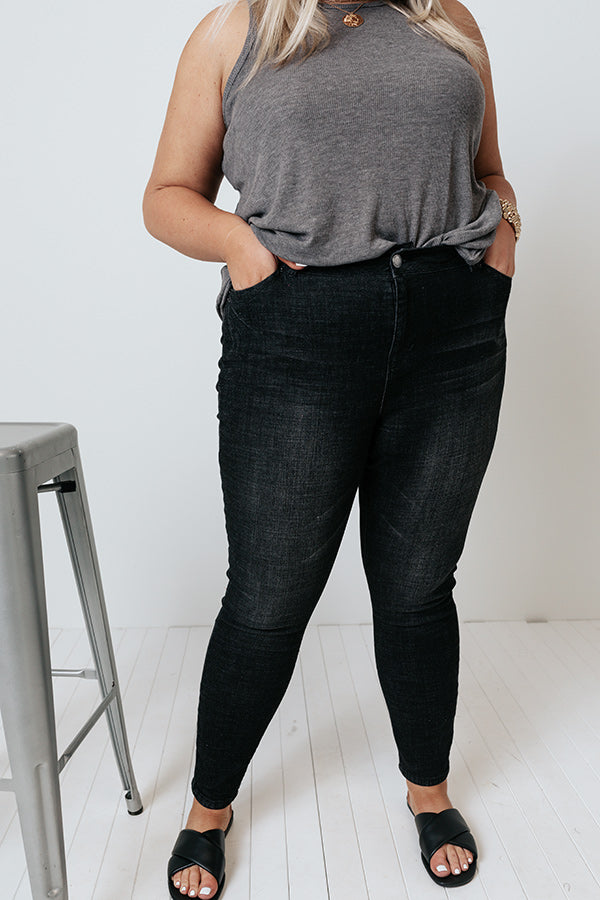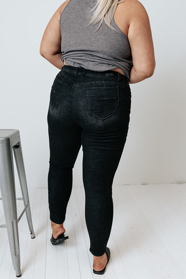 Plus Size - Stay timeless in our edgy black 'Lonny' skinnies featuring lightweight semi-stretch material with subtle accent fading and distressed detailing, a high waistline with belt loops, a classic five pocket cut, a hidden zip fly with a button closure, and a flattering figure hugging silhouette that tapers into ankle-length hemlines that can easily be cuffed! Measurements
