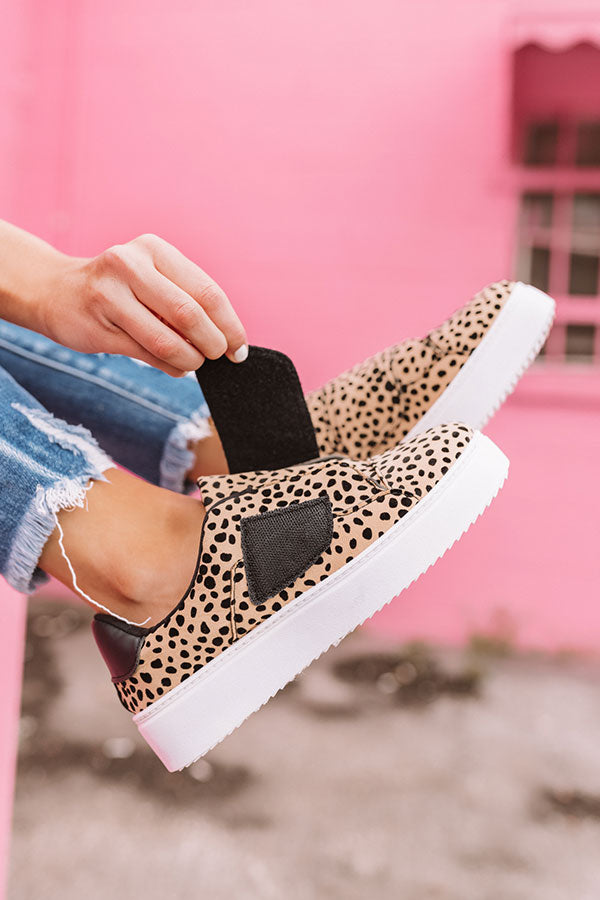 There is no better way to look trendy this summer than with our adorable "Penn" sneaker featuring a sleek lightweight silhouette patterned with a black cheetah print, rounded closed toes, a wide velcro over-the-foot strap, an accent leopard print panel on the heel, and platform soles!