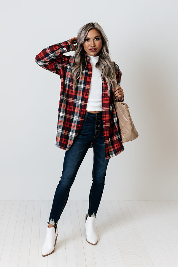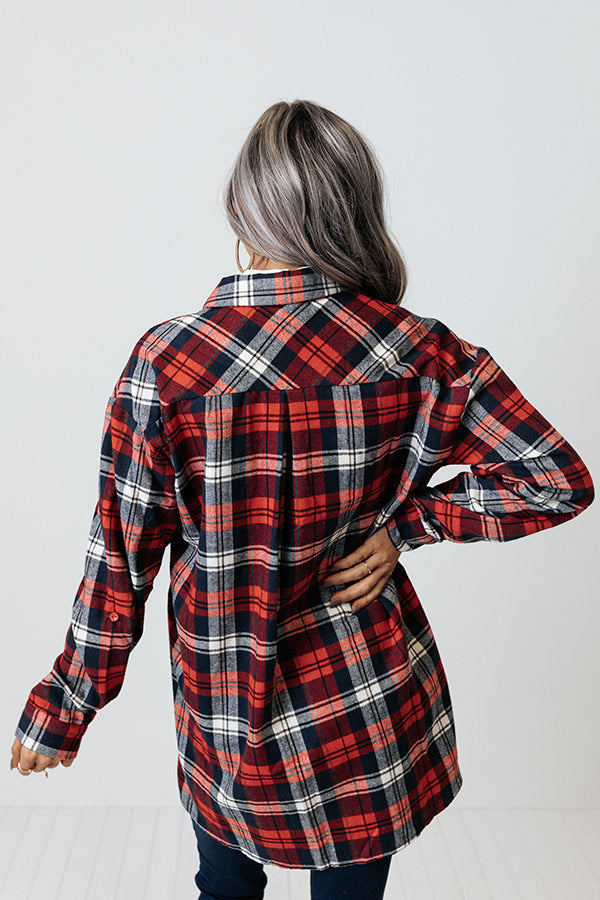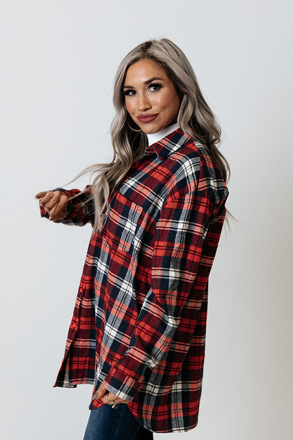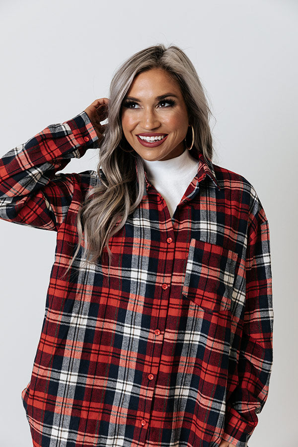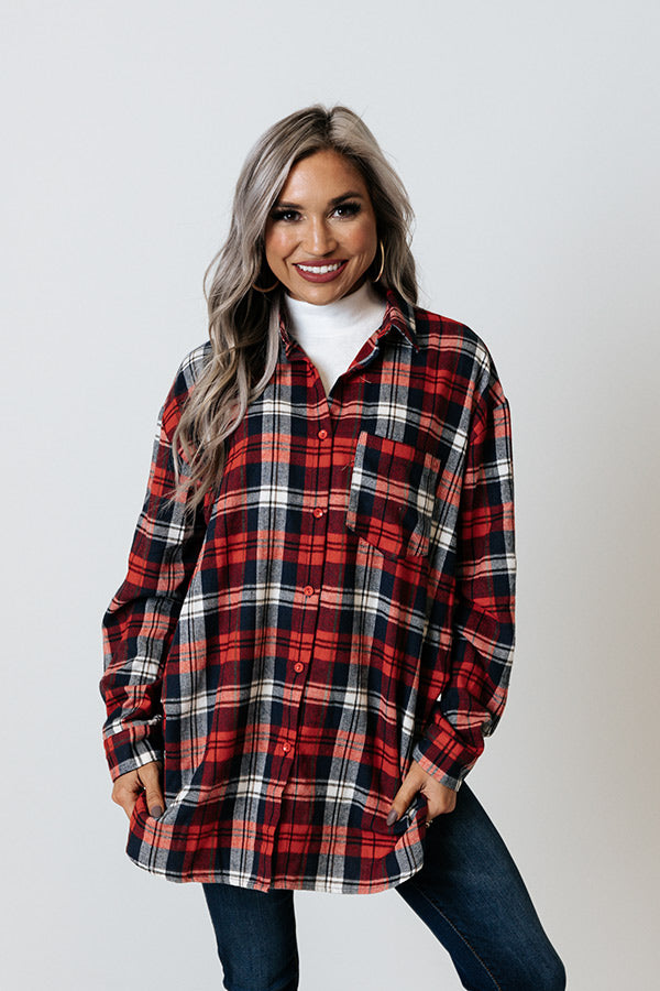 Take the trail less traveled in style with this cute red flannel featuring lightweight material patterned with a navy and white plaid print, a button down front with a collared neckline, long loose sleeves with button closure cuffs, a single accent chest pocket, and a relaxed silhouette that falls into a rounded hemline!
