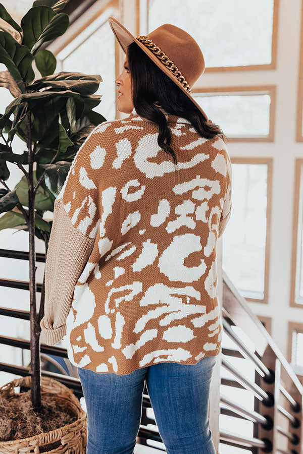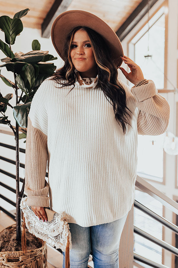 Nothing says business in the front and party in the back like our unique plus size 'Upper East Side Views' sweater featuring soft large knit material, long loose natural hued color block sleeves with oversized rolled cuffs, a camel colored back and bunched turtle neckline patterned with a large white leopard print, and a slouched silhouette that falls into a straight hemline! Measurements