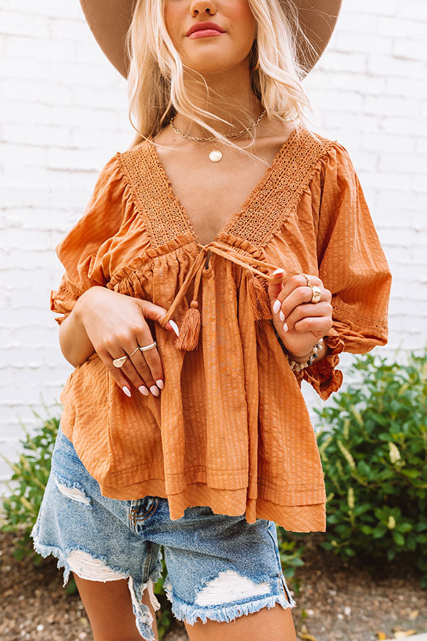 May all your wild dreams come true in this adorable rust colored top featuring lightweight material, a smocked v-cut neckline and upper back with a cinched tie closure waistline, bubble 3/4-length sleeves with elastic cuffs, and a flirty babydoll silhouette that falls into a straight raw-cut hemline!