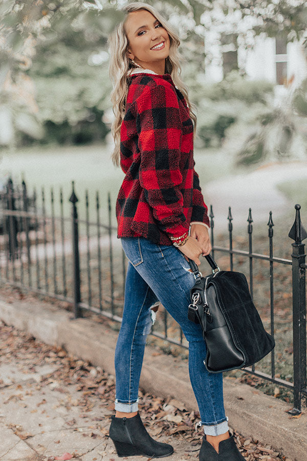 You will feel so delightfully warm in this winter pullover featuring ultra soft thick sherpa material with a red and black buffalo check pattern, a high collared neckline with a button up bodice, long loose sleeves with fitted cuffs, and a relaxed silhouette that falls into a rounded hemline! You can dress this cold weather piece up with some distressed ankle skinnies and a black bootie and backpack, or you can dress it down with our black "Cardio Queen High Waist Legging," a beanie, and "The Sky Sneaker in Black!" Measurements