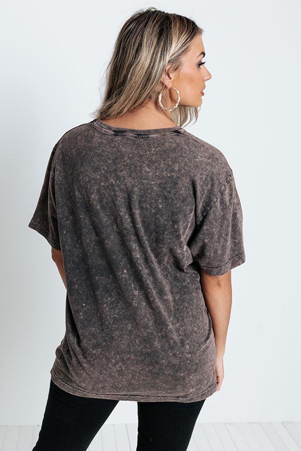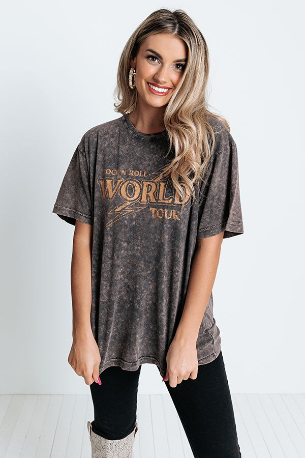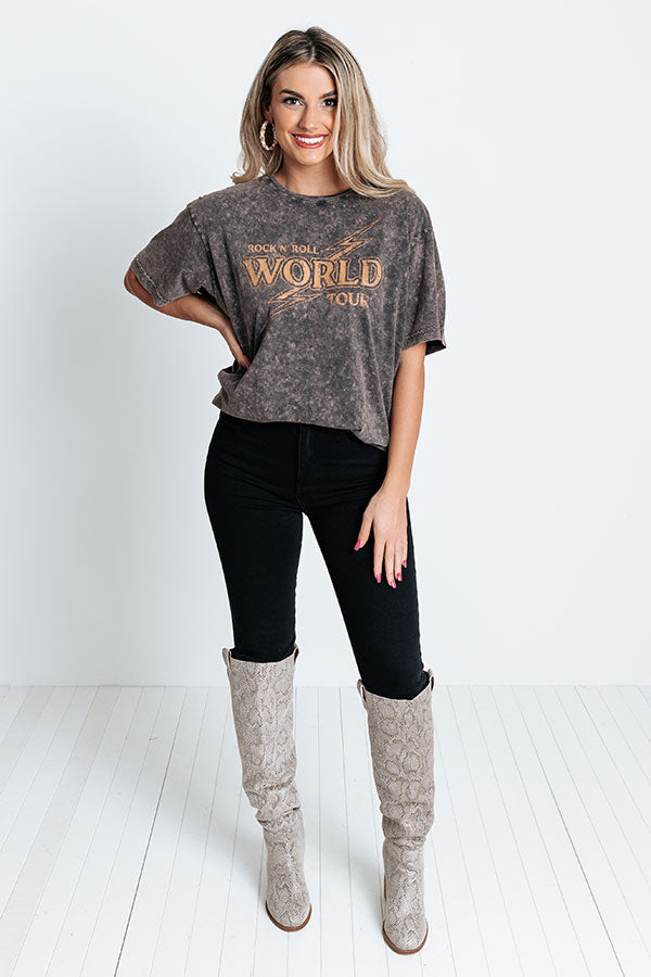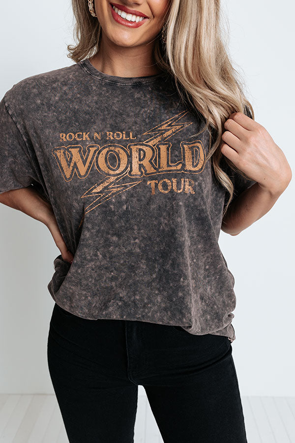 Show off your love for music with our cute charcoal hued 'World Tour' tee featuring soft lightweight mineral wash material with cute light orange lettering and a lightning bolt on the front, a rounded neckline, short sleeves, and a relaxed silhouette that ends in a straight hemline!
