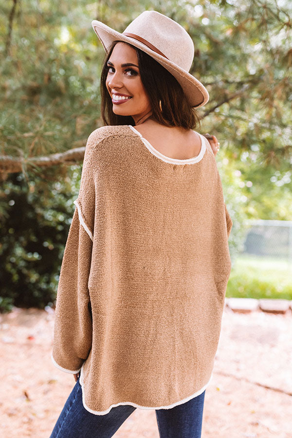 Soothe your "cabin fever" with this charming neutral hued sweater featuring ultra soft but thick tight knit material with subtle texturing, white trim and expose seam detailing, a wide rounded neckline, long oversized sleeves, a single accent chest pocket, and a draped silhouette that falls into a straight tunic-length hemline! Measurements