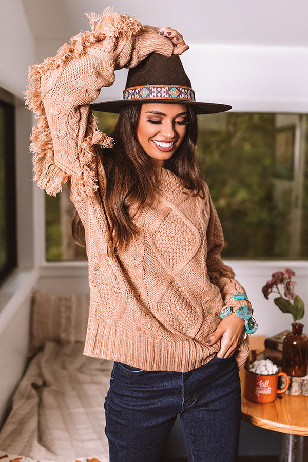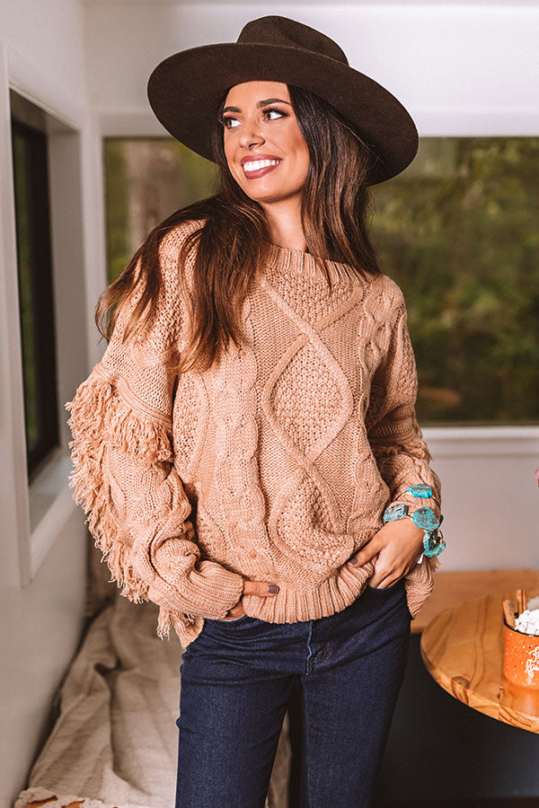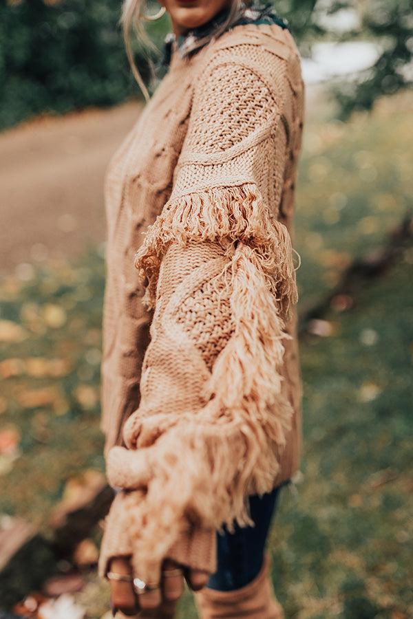 Cozy up for the colder months with this adorable iced mocha colored sweater featuring soft thick material with cable knit texturing, long loose sleeves with fitted cuffs and oversized fringe detailing, a high rounded neckline, and a relaxed silhouette that falls into a straight ribbed hemline!