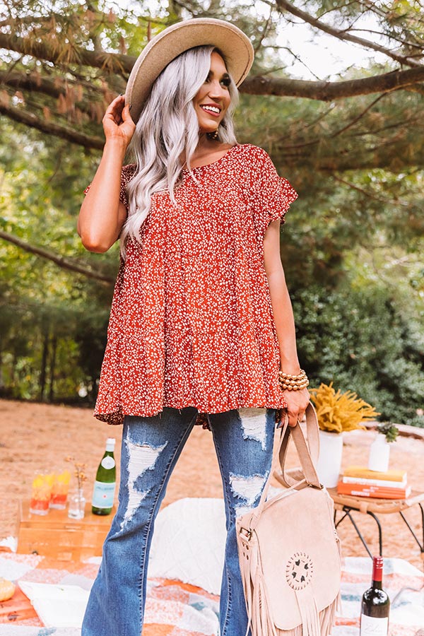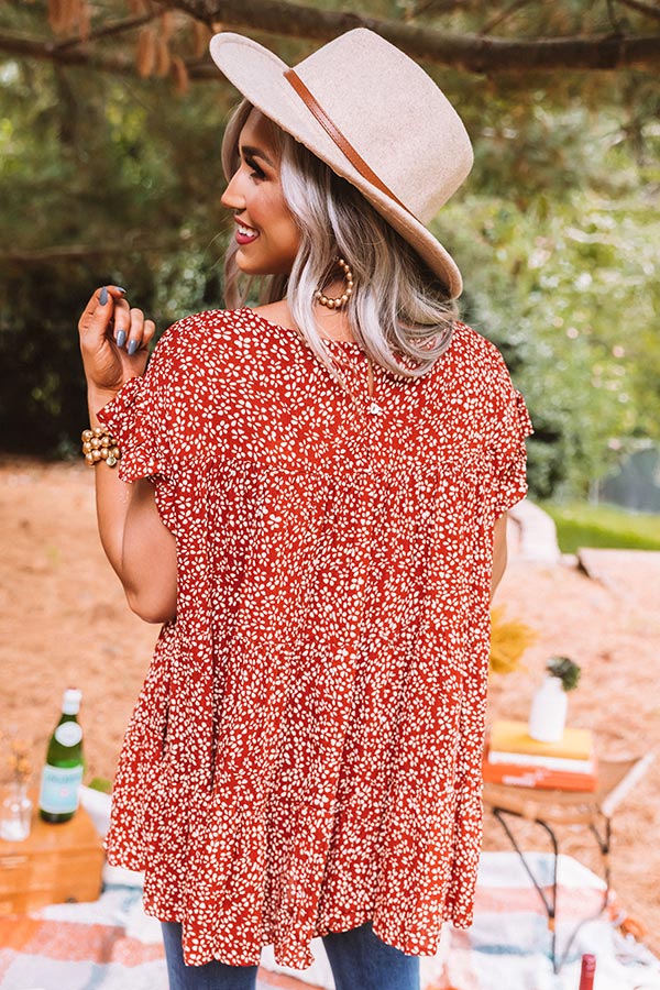 Transition to fall effortlessly with our adorable rust colored "Serious Delight" top featuring lightweight material patterned with a small white floral print, a high rounded neckline, short loose sleeves with ruffled trim detailing, a keyhole accented upper back with a button closure, and a relaxed tiered babydoll silhouette that falls into an uneven hemline! Measurements