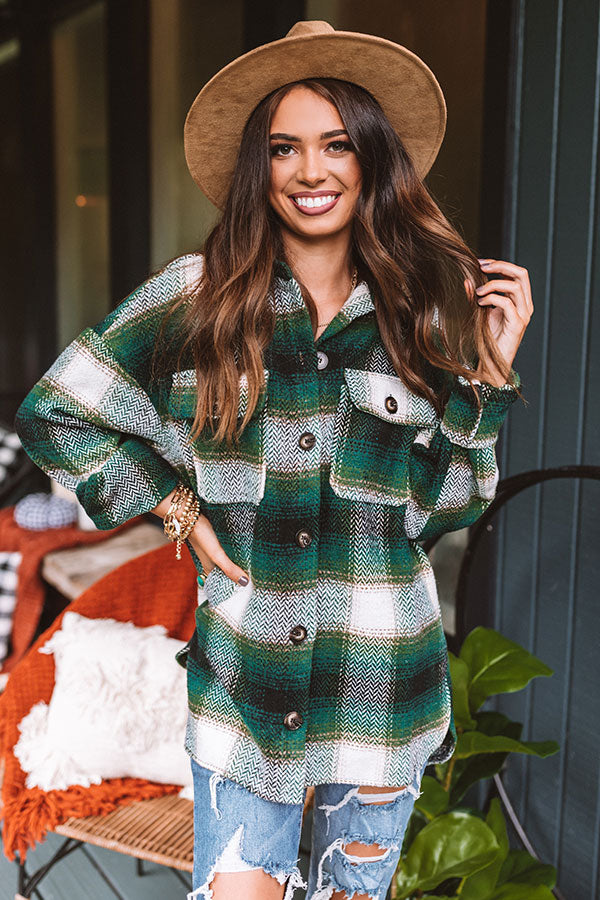 Cozy up for fall in adorable "State Park" jacket featuring thick warm material patterned with a large green plaid print, long loose sleeves with fitted button closure cuffs, a button down front with a collared neckline, accent chest pockets with flap closures, and a relaxed silhouette that falls into a rounded hemline! Measurements