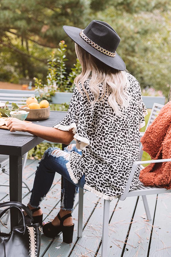 Take a walk on the wild side in our charming ivory colored "Town Hall" shift top featuring lightweight flowy material patterned with a large black leopard print, a high rounded neckline, short loose sleeves with flared cuffs, fringe trim detailing, and a relaxed silhouette that falls into a straight hemline with accent side notches! Measurements