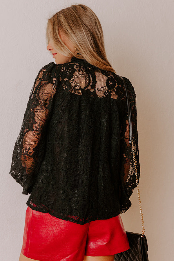 - From chic days to fabulous nights, this stunning lace top brings effortless charm! Its tied neckline and delicate floral design add a romantic touch to any look. - Floral lace material - A built-in, semi-sheer lining beginning above the bust - A v-cut with a front tie neckline - Long sleeves with elastic cuffs - A relaxed silhouette that ends in a straight hemline