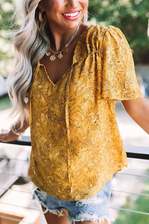 Get a sip of summer with this charming mustard hued shift top featuring lightweight material patterned with a boho floral print, a v-cut neckline with a tie closure, flowy short sleeves, and a relaxed silhouette that falls into a straight hemline!