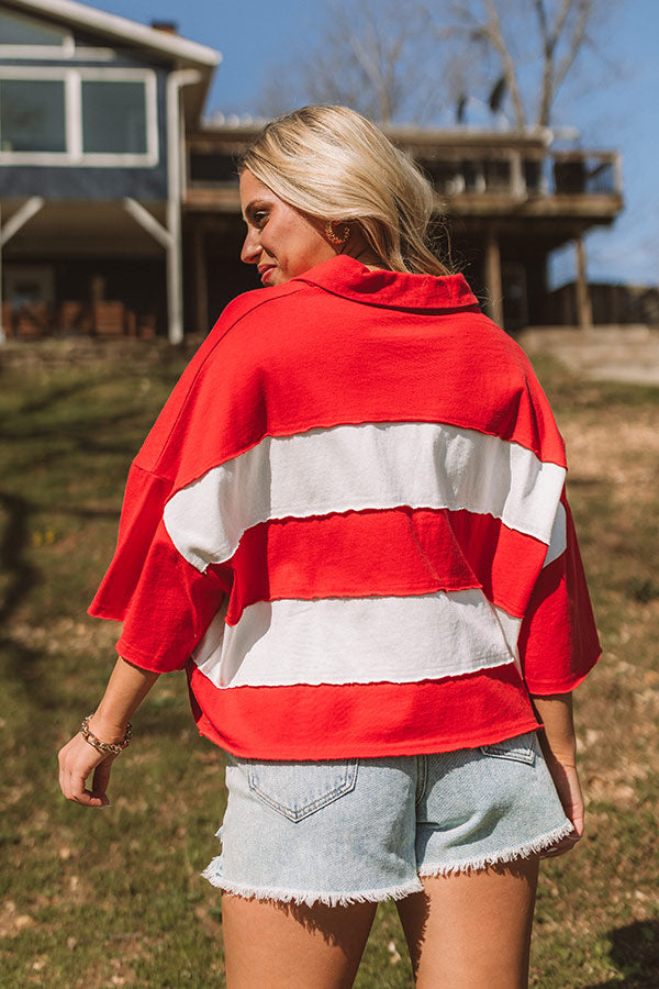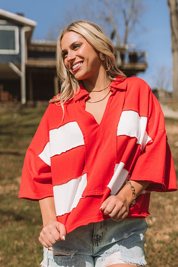- Keep the effortlessly cool looks coming all season with this trendy crop tee! With raw seams and an oversized fit, it's the go-to pick for laid-back looks, casual BBQs, or watching fireworks with friends. - Unlined material with a whale and red hued wide stripe design - Unfinished seam accents - A collared v-cut neckline - Short, loose sleeves with drop shoulders and unfinished cuffs - An oversized silhouette that ends in an unfinished, cropped hemline