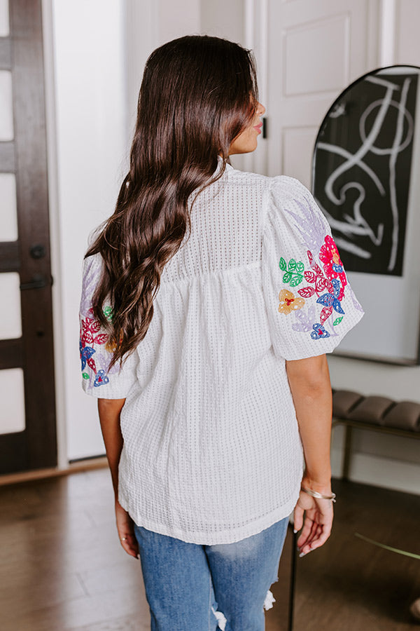 - Short puff sleeves with a pink, purple, yellow, green, and blue hued embroidered floral design and elastic cuffs