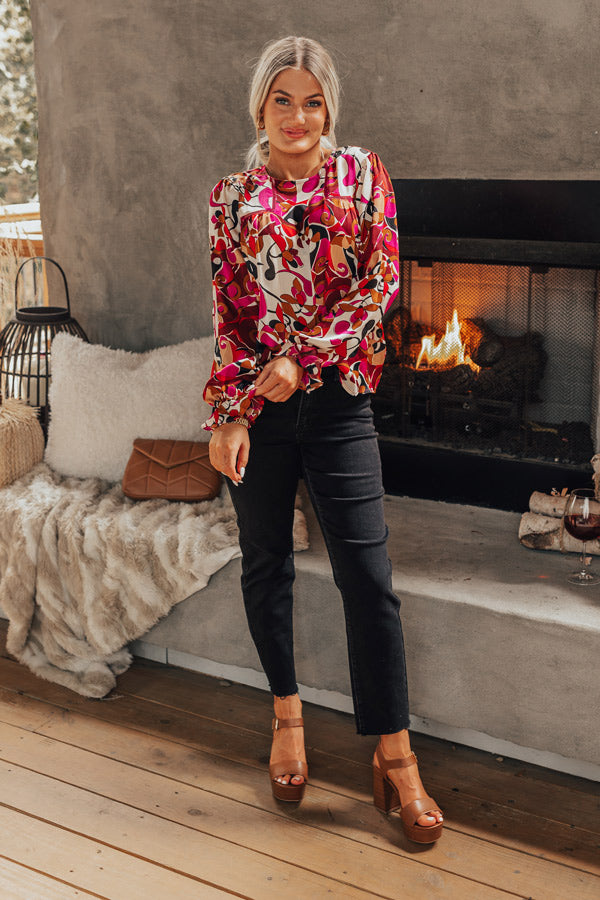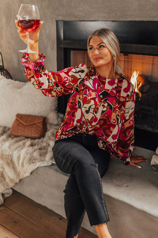 - Unlined semi-sheer material with purple, brown, and red hued abstract print