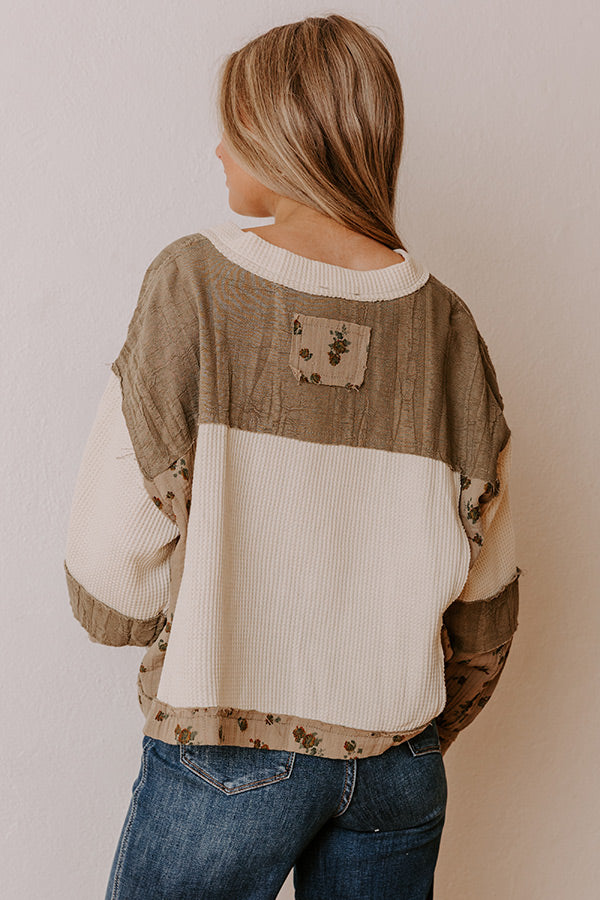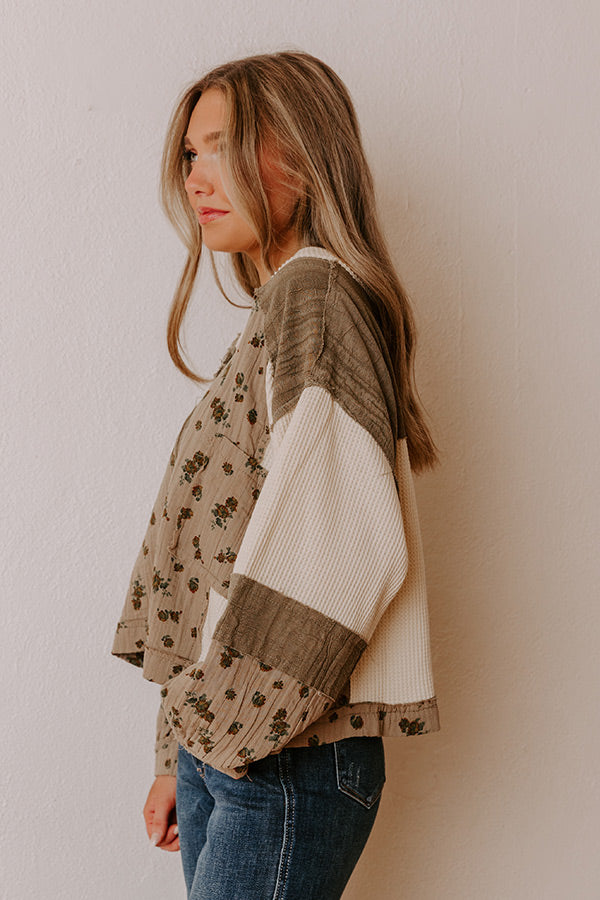 - A color block design featuring cream colored waffle knit material, lightweight subtly textured material, and soft floral print material featuring yellow, green, and rust